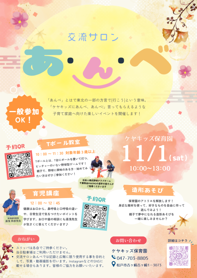 今回は【Tボール教室】【育児講座】【造形あそび】の3つを開催します⚾🎨👶